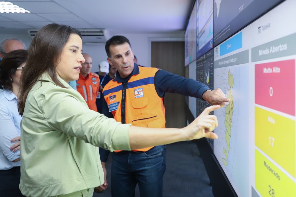 Ao lado da vice-governadora Priscila Krause (PSD), a Chefe do Executivo estadual observou o andamento das ações que já podem acontecer no apoio aos pernambucanos diante da previsão da Agência Pernambucana de Águas e Clima (Apac) até a próxima terça-feira (21), com intensidade de moderada a forte.