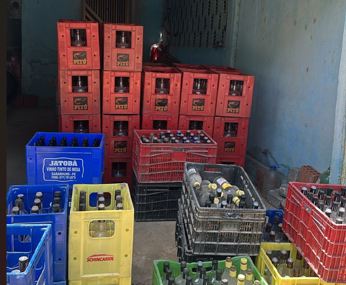 A ação foi desencadeada após denúncia sobre a produção e venda de bebidas de origem duvidosa. No local, foram encontrados diversos galões com líquido semelhante a álcool, vasilhames vazios, caixas d’água utilizadas no processo de produção e um botijão com torneira adaptada para engarrafamento.